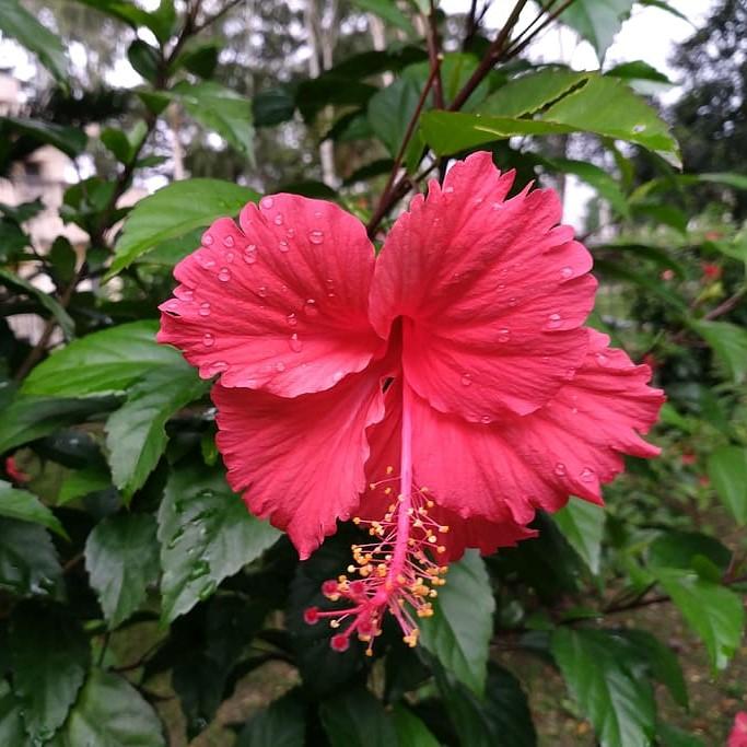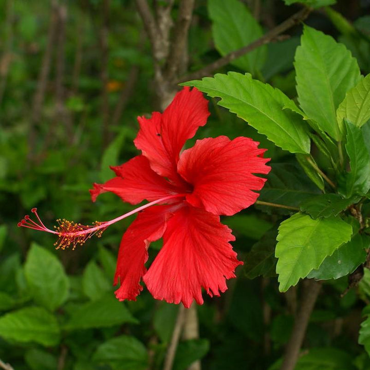 Hibiscus Standard is a large tender tropical shrub treated as an annual with toothed foliage and large reddish pink to crimson tube-like flowers with a showy extended stamen. Outside plants in their zones will flower year-round or till frost, while indoor plants bloom through spring until late summer. Grows best with full sun and rich, moist well drained soils.