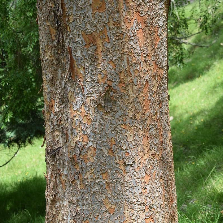 Bosque Laceleaf Elm is a medium-sized upright spreading deciduous  tree with a grey exfoliating trunk.  The narrow shiny dark green leaves have small teeth that can turn an undistinguished yellow in fall, or occasionally more interesting shades of yellow, orange or purple.  Insignificant small reddish-green flowers bloom in fall and give way to papery wing-like seed pods that mature mid-fall.  Grows best with  full sun and rich well-drained soils.   Bosque has excellent resistance to Dutch Elm disease and Elm Leaf Beetle.  Can tolerate both dry and wet sites