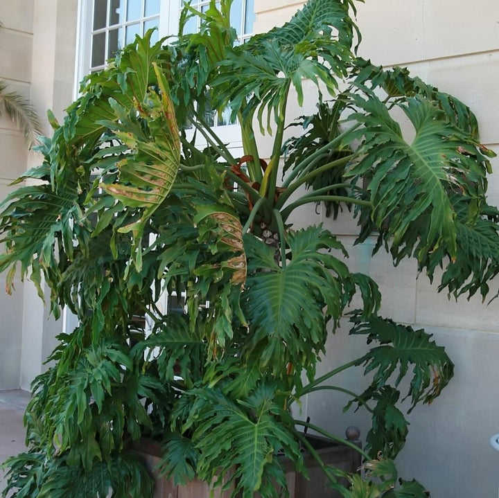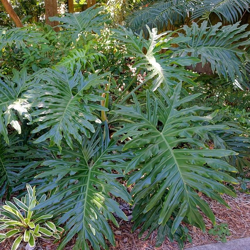 Split-Leaf Philodendron is a large non-climbing woody evergreen shrub with huge deeply-dissected foliage that rises up on long stalks from the crown in a rosette-like formation. The small white flowers rarely bloom when indoors. Grows best with bright indirect sun with protection from afternoon sun and consistently moist well-drained soils. Planting in a pot can help restrict the plant's size for patios or indoors- 6 1/2 ft is typical for a potted Split-Leaf.
