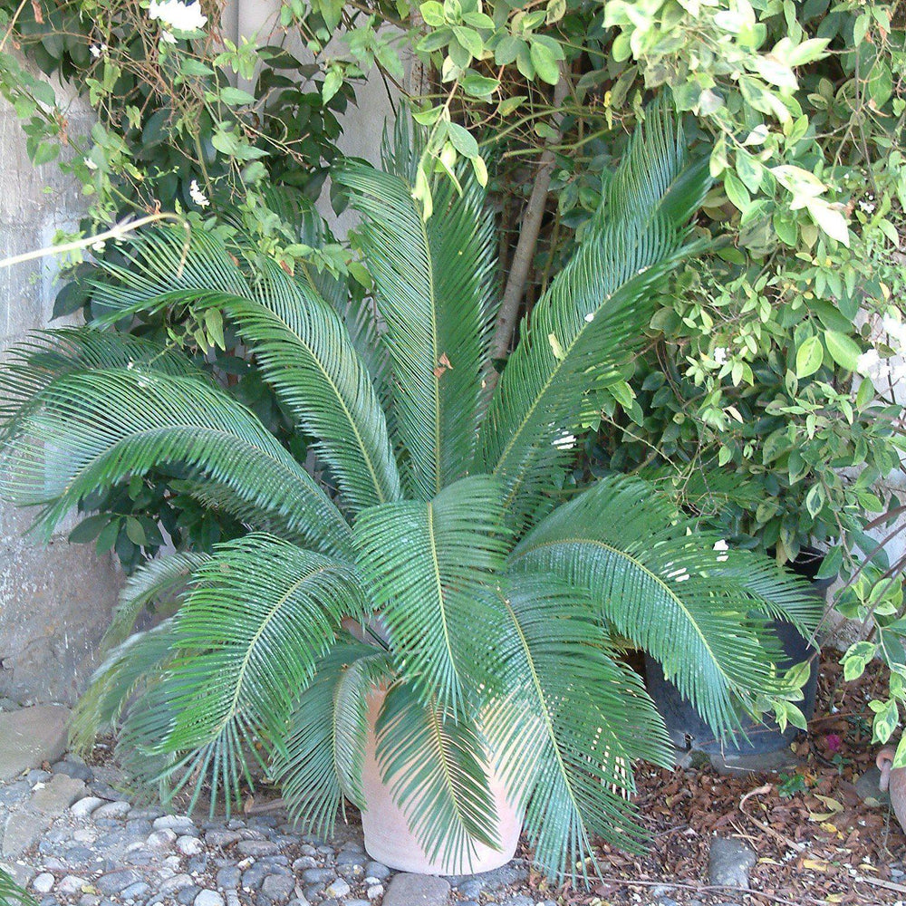 Sago Palm is a very slow growing symmetrical evergreen shrub that, despite the name, is closer to a conifer than a palm. The arching, palm-like palmate foliage with revolute edges sits atop a shaggy upright trunk creating a feathery rosette. Grows best with part sun and consistently moist well-drained sandy soils. Males produce upright yellow pollen cones, while females will produce round cones with bright red seeds if a male is nearby. Does not flower when indoors. Drought tolerant once established.