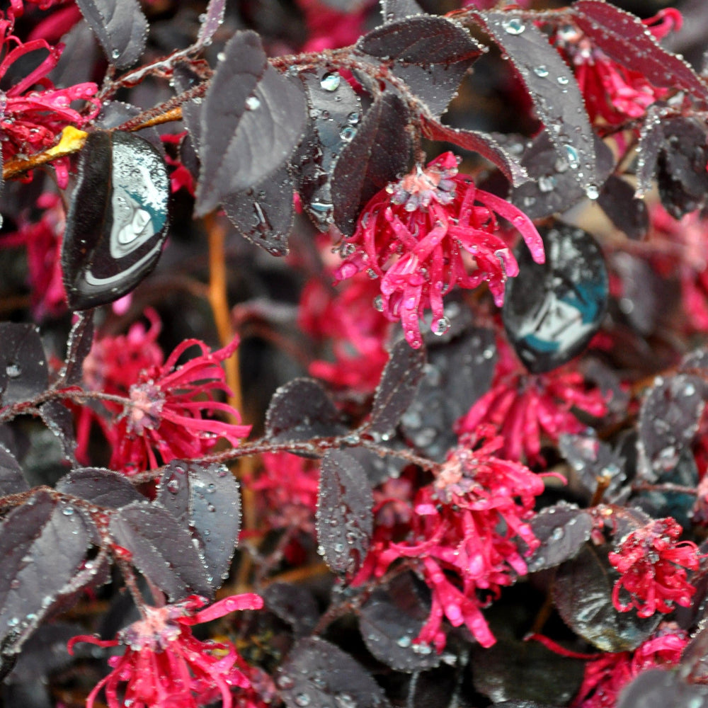 Red Diamond Fringe Flower is a tidy evergreen shrub with rich deep purple and burgundy foliage that holds its color year round and heavy blooms of vivid red fringe-like flowers in late winter through spring. Best color in part sun and moist, acidic, well-drained soil.