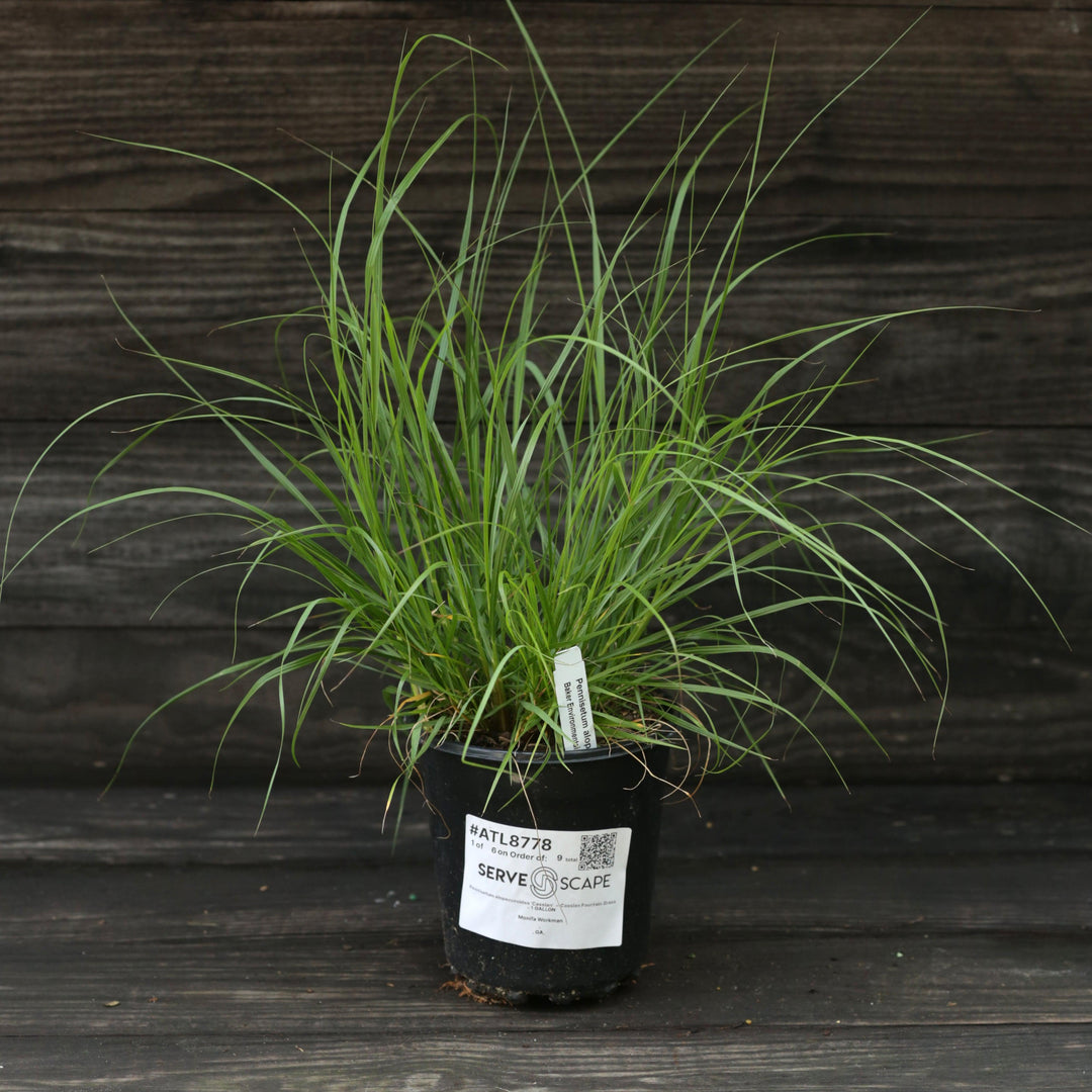 Cassian Fountain Grass is a dwarf ornamental grass with fluffy bottle-brush like pinkish-white flower spikes that bloom from late summer into fall. The narrow green foliage turns shades of orange and red in fall. Prefers part sun and well-drained soils. Drought tolerant once established.