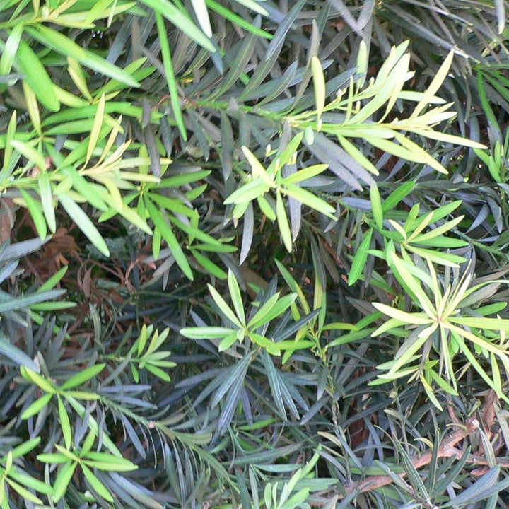 Maki Shrubby Yew Podocarpus is a slow-growing mid-sized evergreen shrub with dense upright branching and small green needle-like foliage. Best color in part sun and moist well-drained soils.