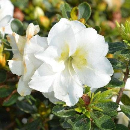 Perfecto Mundo Double White Azalea is a reblooming evergreen shrub with a tidy low-mounding habit and dark green leaves. Abundant double white flowers bloom throughout spring and begin again from mid-summer until frost. A very versatile plant that prefers partial sun, particularly in hot climates, with acidic rich, well-drained soils. Azaleas are excellent pollination and butterfly attractors. Resistant to lacebug.